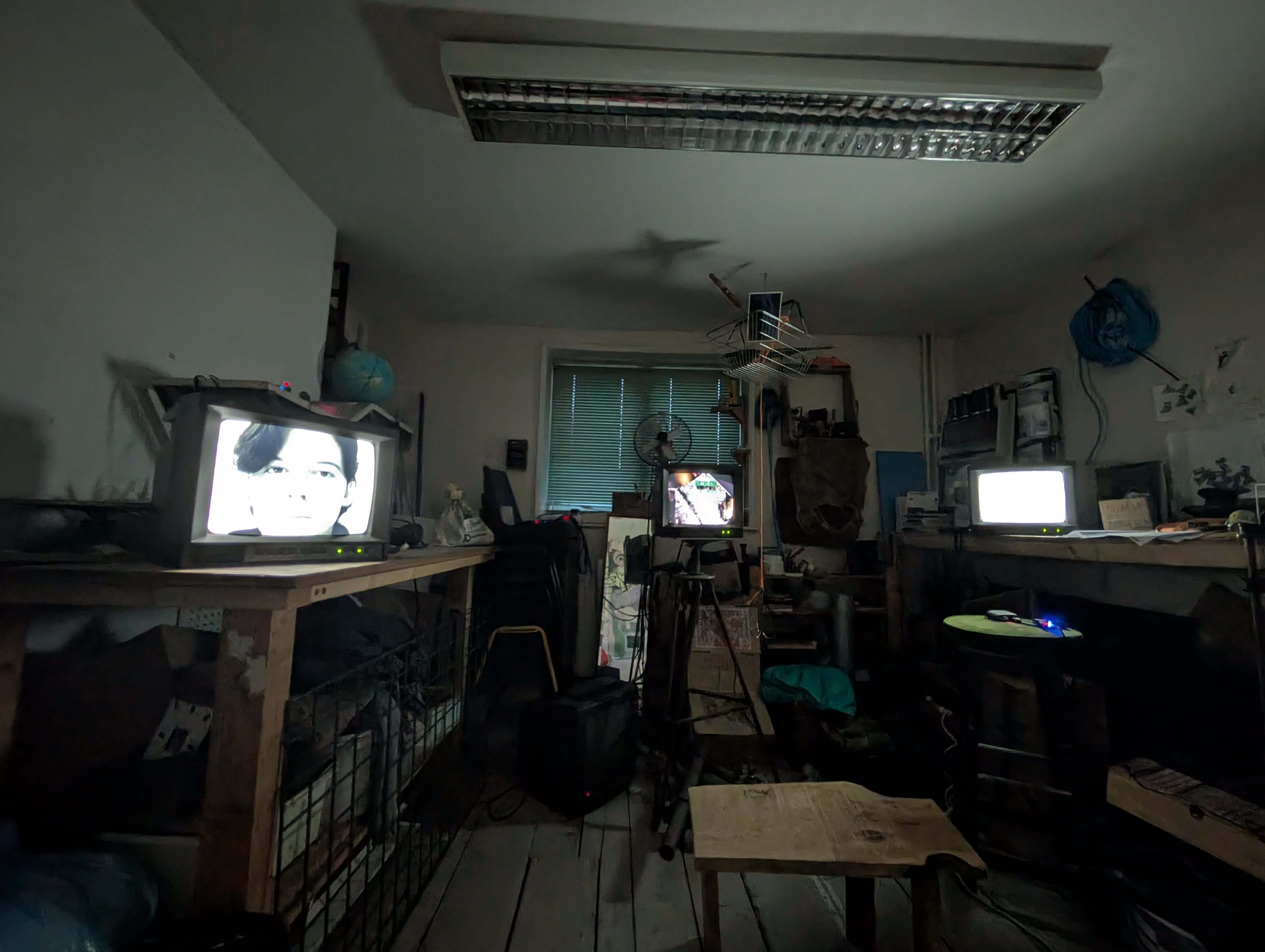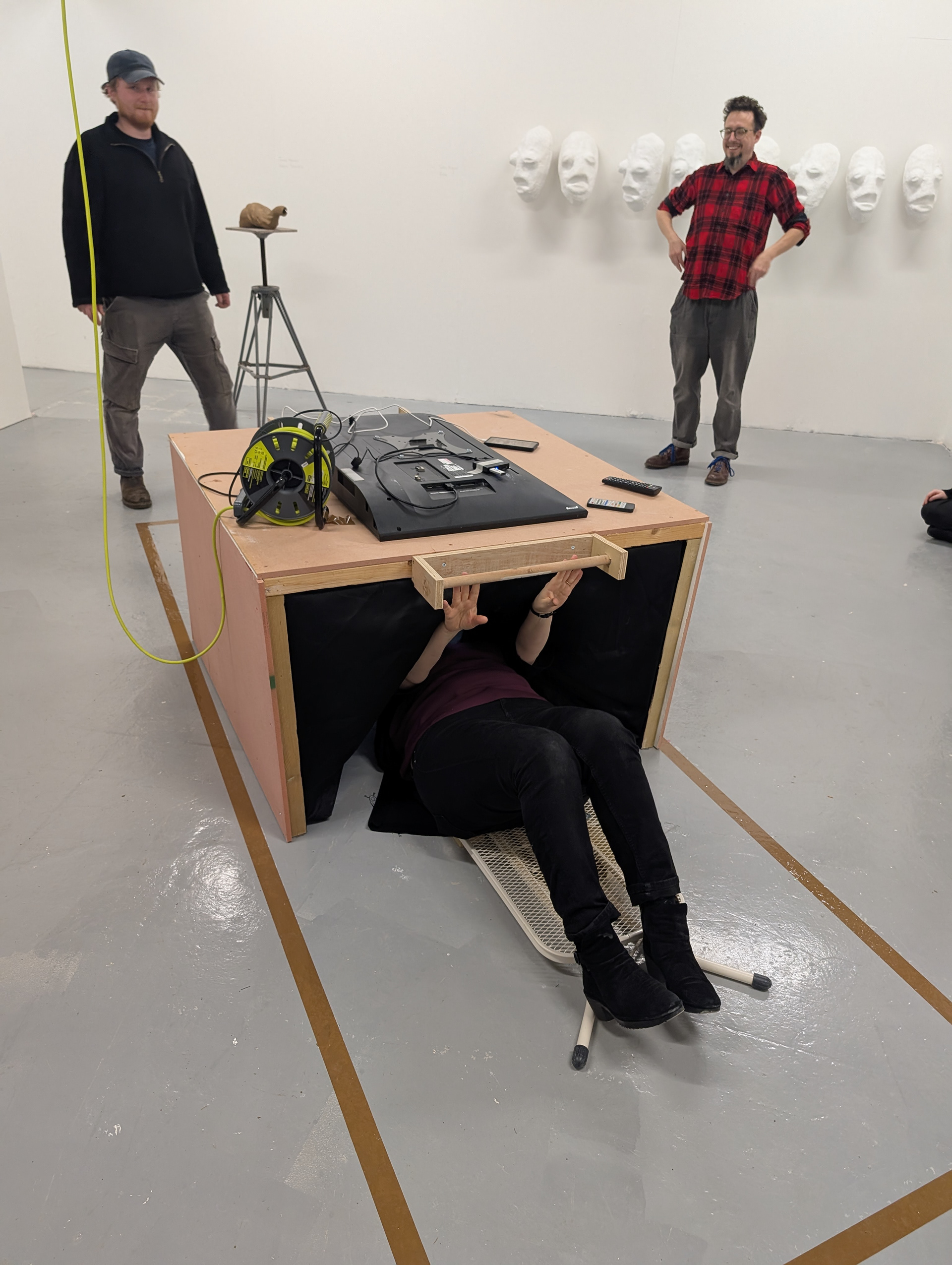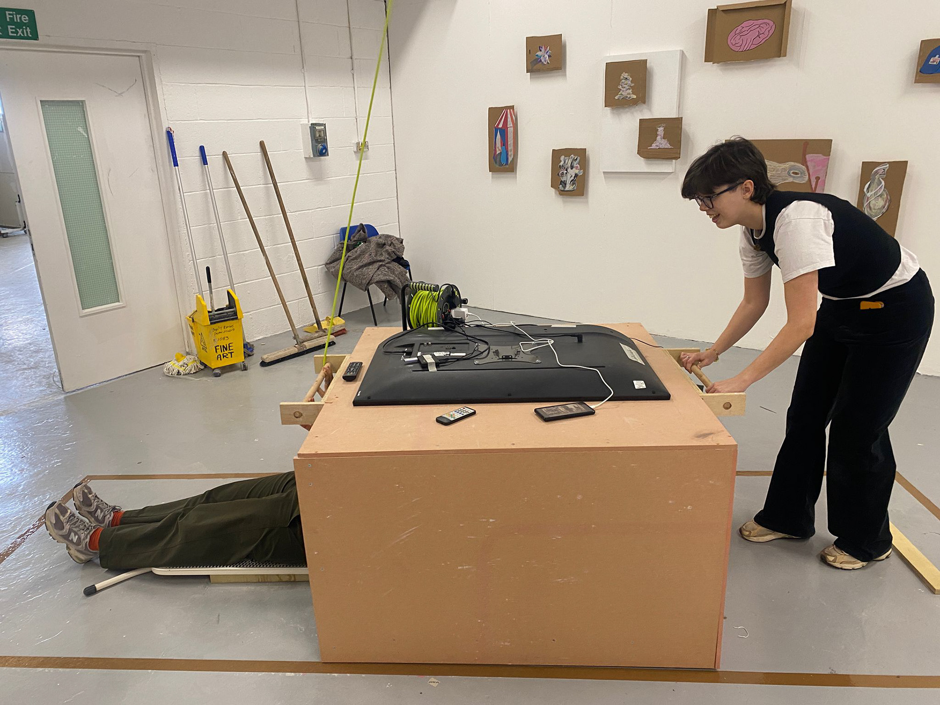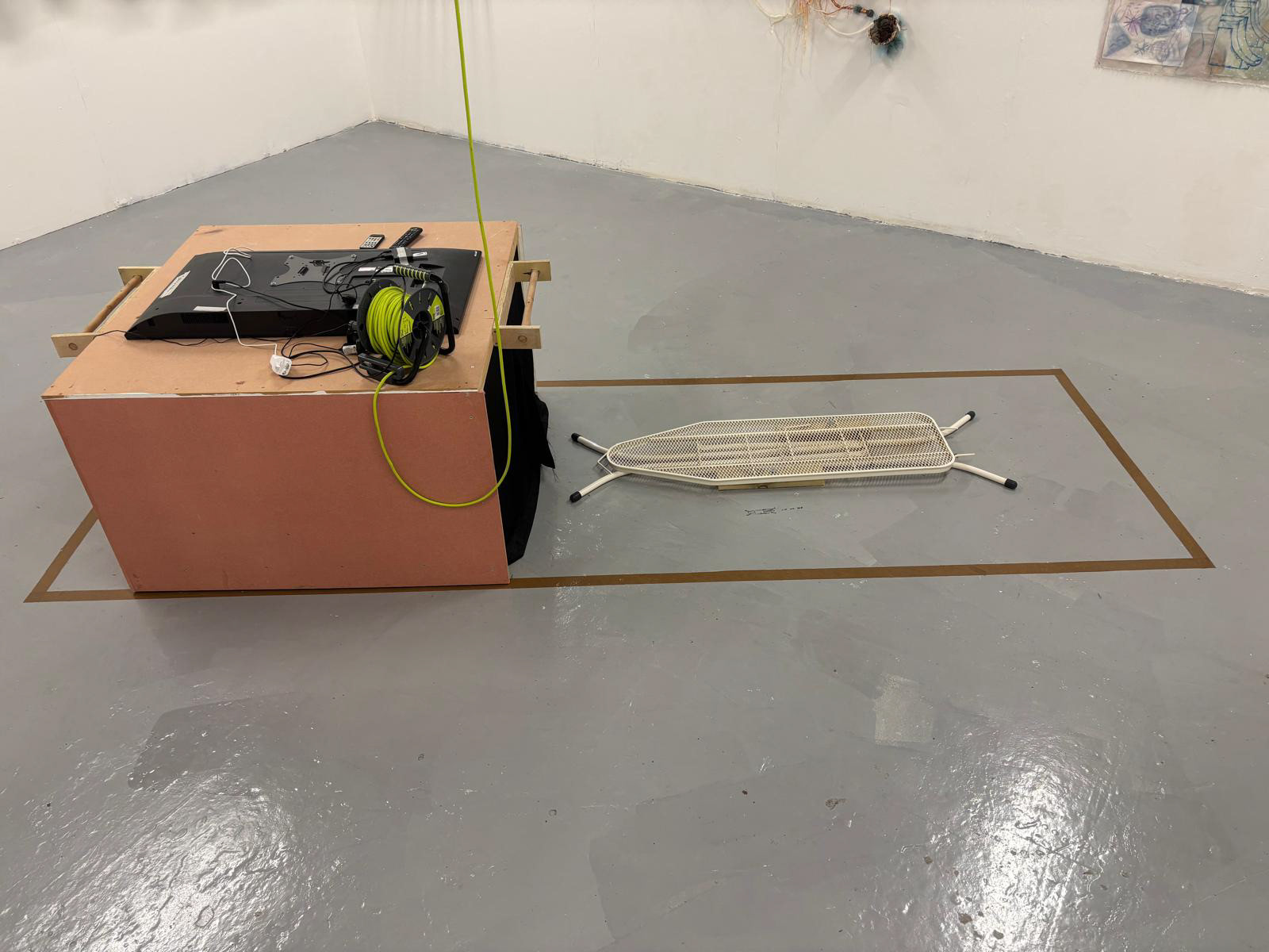 Image of Sauna Installation, which featured the following videos, the first on the TV on the 'ceiling' inside the box, and the second on a mobile phone screen strewn on the top of the box. Visitors were invited to lie on the ironing board and pull the box (on wheels) over themselves.